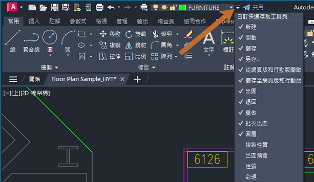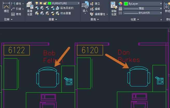 假設您要讓 FURNITURE 圖層變成目前圖層。當然,您可以直接開啟圖層清單並捲動,直到找到 FURNITURE 圖層。但是,我們改為使用「設為目前的」快速變更目前圖層。