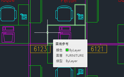 假設您要使用「變更為目前圖層」,將這些椅子從 CHAIR 圖層變更為 FURNITURE 圖層。