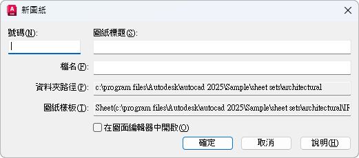 指定圖紙號碼。建議您第一次建立圖紙時,不要填寫圖紙號碼。依預設,新圖紙的圖面名稱和配置名稱將為圖紙號碼及圖紙標題。