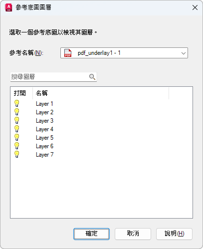 使用 DWFLAYERS、PDFLAYERS、DGNLAYERS 或 ULAYERS 指令或在選取的參考底圖上按一下滑鼠右鍵,並於快顯功能表上按一下圖層。