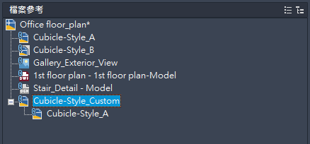 樹狀視圖的頂層永遠展示目前圖面。參考檔案顯示在下一層。可以開啟包含自己的巢狀檔案參考的參考檔案,以展示更深層級。在樹狀視圖中進行選取時,一次只能選取一個檔案參考。