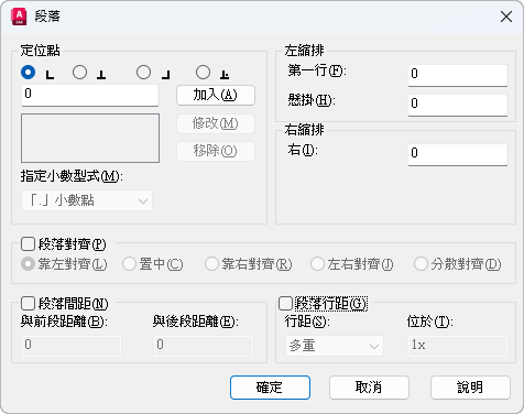 指定定位停駐、縮排、控制段落對齊方式、段落間距和段落行距。