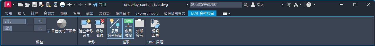 選取圖面中的 DWF 參考底圖時,功能區上會顯示「DWF 參考底圖」關聯式頁籤。