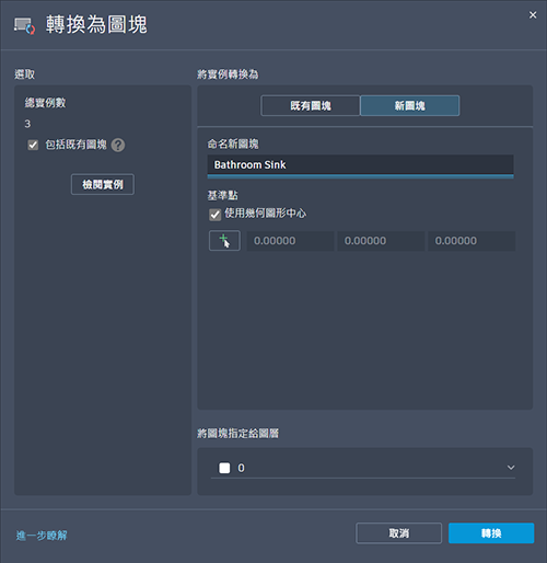 您也可以將來源物件或選取的實例轉換為新圖塊。在「轉換」對話方塊中,透過指定圖塊名稱和插入點定義新圖塊。插入點預設會設定為選取的幾何圖形中心。