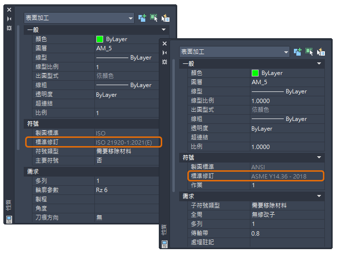 表面加工符號現在支援 ISO (ISO 21920-1:2021(E)) 和 ANSI/ASME (ASME Y14.36 - 2018) 標準的最新修訂。