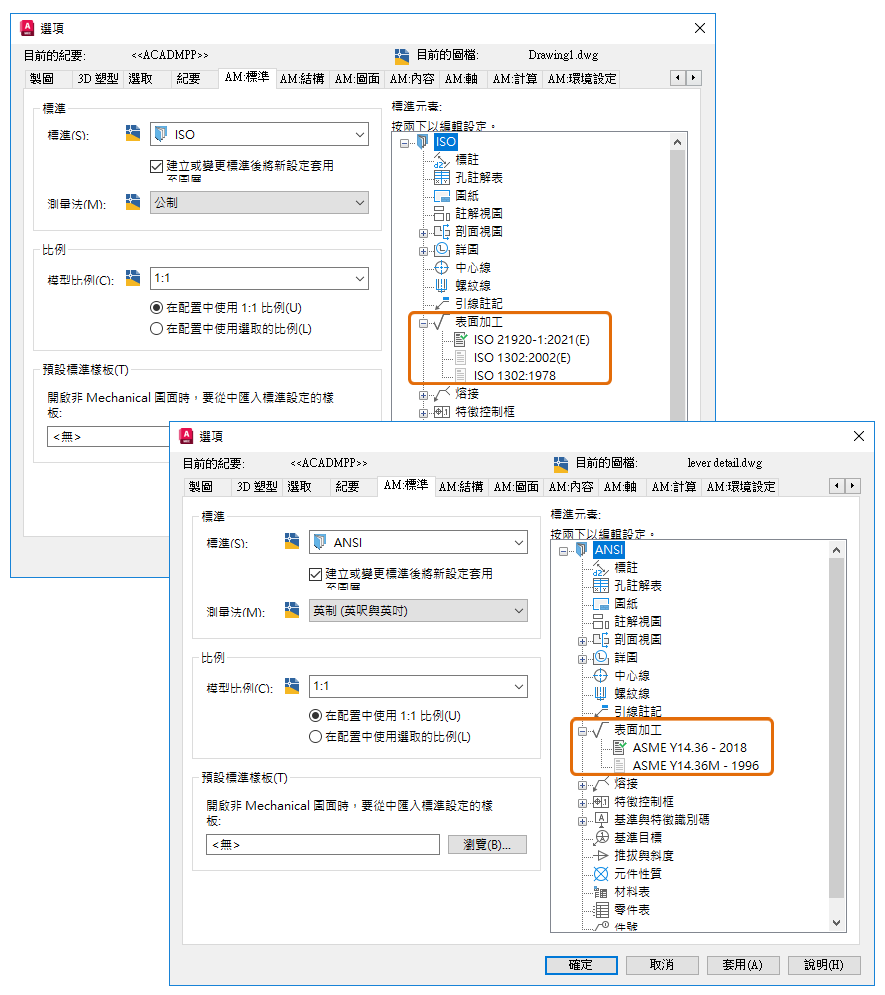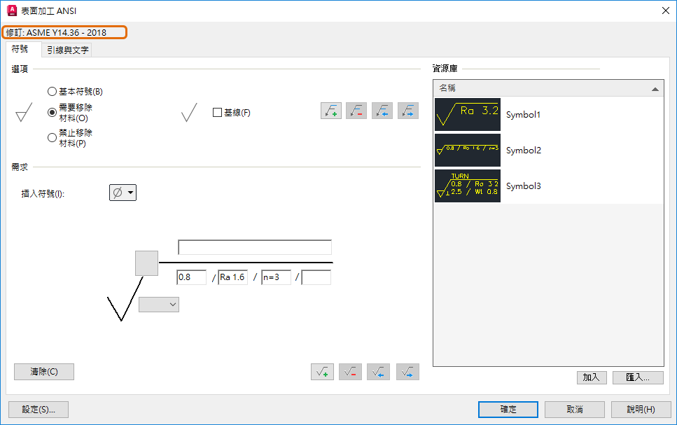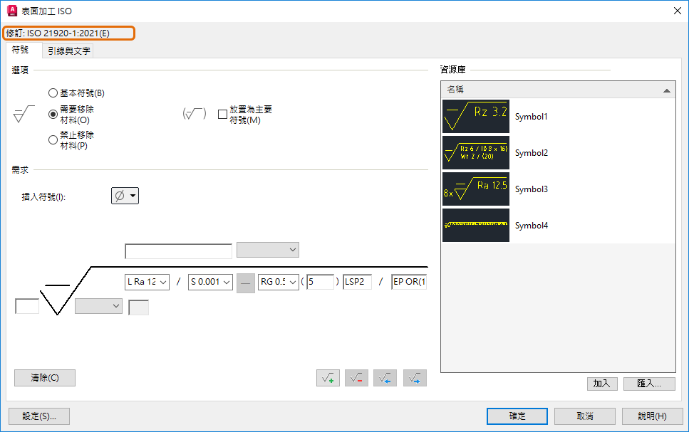 「表面加工設定」對話方塊會顯示表面加工符號的最新 ISO 和 ANSI/ASME 修訂。對應的符號類型和預置清單會自動更新,以反映最新的修訂。