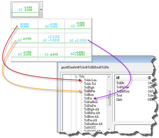 「公差」下拉清單中的公差縮圖對應「系統編輯器」中「Acad/M」>「DimSet」>「公差」下的前八個項目。這些項目的名稱以「Tol」(例如 TolHigh) 開頭。剩餘項目是指公差的對照單位表現法,且其名稱以「-Alt」結束。例如,TolHigh-Alt 是 TolHigh 的對照單位表現法。