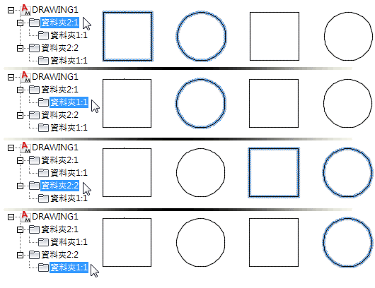 下圖展示了一個包含兩個資料夾的圖面。資料夾 1 套疊在資料夾 2 中。Mechanical 瀏覽器展示了資料夾 2 的兩個例證:資料夾 2:1 和資料夾 2:2。例證識別碼 (附加到資料夾名稱末端的號碼) 可唯一識別例證。