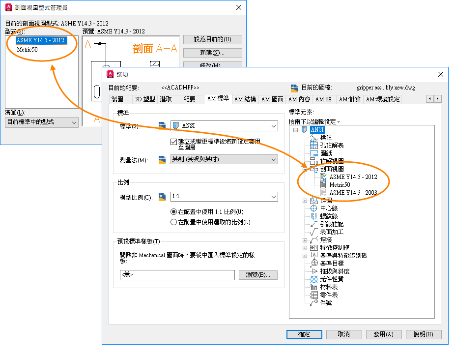 可控制 AutoCAD Mechanical 工具集物件外觀的設定會儲存到一個稱為製圖標準的具名設定集合中。剖面視圖型式會與製圖標準一起儲存,並被視為製圖標準的修訂。