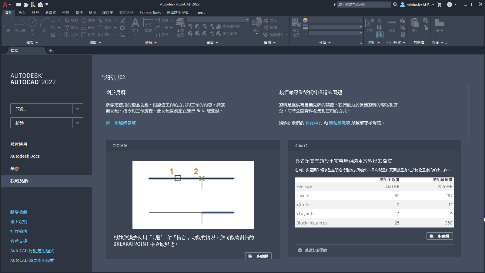 產品使用見解會顯示在「開始」頁籤上。「我的見解」是根據您使用 Autodesk 的狀況而向您顯示的資訊。內容設計為具有資訊性和可行性。您可以看看有什麼可以嘗試的指令和功能建議,以及其他生產力見解。