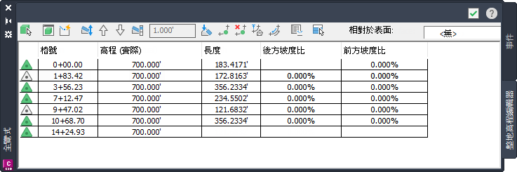 在圖 1 中,高程編輯器顯示了方形地勢線的高程,其中包括方形地勢線與其他地勢線交叉的兩個分割點。在高程編輯器中,第一欄中的點符號會在與其他地勢線相交的任何點上有一個加號 (+)。