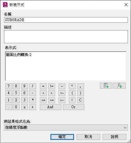 建立後,可以使用該表示式做為標示型式和表格型式的元件。只需建立點位高程地形標示型式 (採用稱為 SUBGRADE 的表示式)。使用「新表示式」對話方塊,如圖 10 所示。