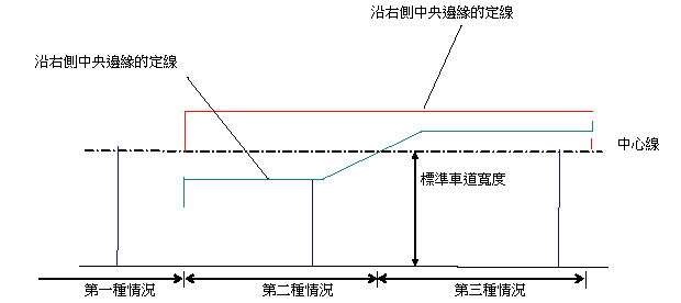 定義中央邊緣的定線有時不顯示 (第一種情況)、有時位於道路中心線之外 (第二種情況),還有時位於中心線之內 (第三種情況)。若要使用此次組合,您應具有單獨的可定義中央左側邊緣和右側邊緣的定線。可能需要為每個個別中央定義單獨的廊道模型區域。