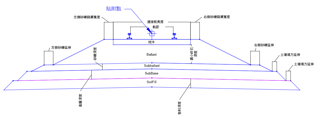 其左右兩側應緊跟邊坡次組合,以接近挖方和填方條件下的既有地面。它可回應軌道鐵路超高。