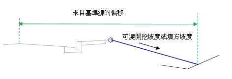 可以用於取代固定的「邊坡偏移」,並將邊坡偏移與偏移定線關聯。以下物件類型可以用作指定偏移的目標:定線、聚合線、地勢線或測量圖形。 |