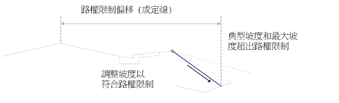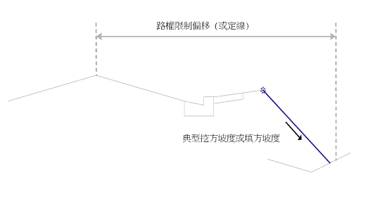 如果典型坡度不在路權線限制範圍以內,則使用更陡的坡度。如果此更陡的坡度仍然不在路權線限制範圍以內,則使用者可以選擇對行為進行控制。