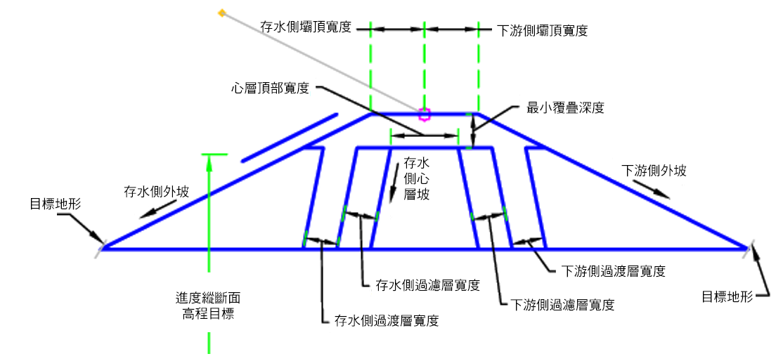 | 進度縱斷面 | 可根據高程目標的高程來顯示水壩進度。以下物件類型可以用作指定高程的目標:縱斷面、3D 聚合線、地勢線或測量圖形。 | 可選 |