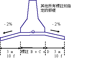 注意事項:除非另有說明,否則所有標註均以公尺或英呎為單位。除非指明是帶有「%」符號的百分比坡度,否則所有坡度均為水平寬度比垂直高度格式 (例如,4 : 1)。