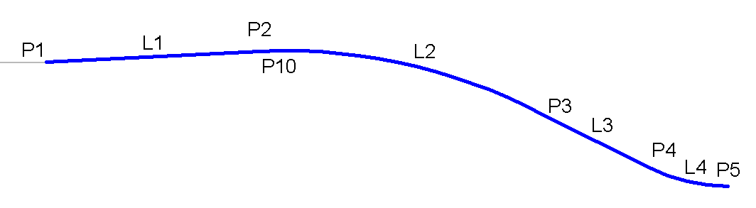 然後會檢查是否拋物線前坡度比和後坡度比是否為相同的值。如果找到相同的坡度比,則會繪製連接。如果它們不相同,則會建立凹陷或凸形拋物線豎曲線。如果適用,將為拋物線豎曲線上的高點或低點加入一個點。
