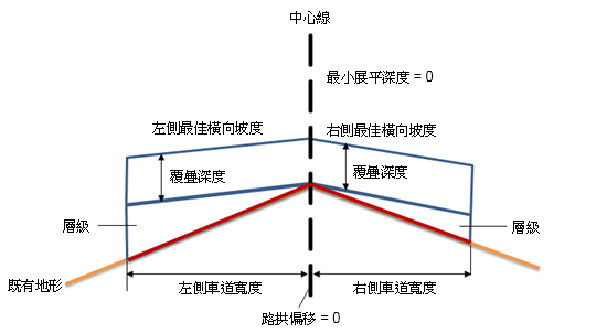 註: 要加上還是減去坡度公差,則是取決於,何者將會讓既有地形橫向坡度的值和理想橫向坡度的值更加接近。