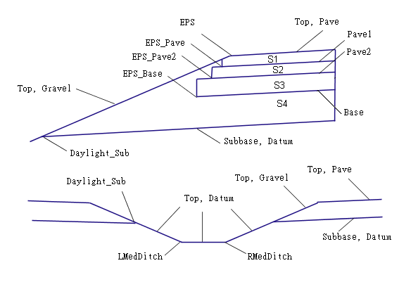 鋪路的路肩將採用為基準線定線的超高規格中的左側和右側內側路肩坡度而定義的坡度。這些坡度將從內側車道邊緣向內套用。基層地面將採用與完工整地地形相同的坡度,並向內延伸到與溝渠坡度的交點。