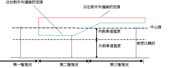 定義中央邊緣的定線有時不顯示 (第一種情況)、有時位於道路中心線之外 (第二種情況),還有時位於中心線之內 (第三種情況)。