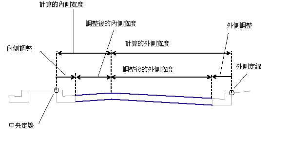 內側調整和外側調整:當用於內側邊緣或外側邊緣的定線與實際車道邊緣之間具有固定偏移時,將提供「內側調整」和「外側調整」參數。例如,用於「中央邊緣」的定線可能位於路緣背面而非鋪面邊緣上。在這種情況下,應將「內側調整」參數設定為路緣的寬度。