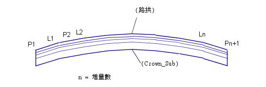 透過從貼附點減去「路拱高度」來計算基線的中心,並且透過圍繞貼附點對稱套用「寬度」和「坡度」來計算左側車道邊緣和右側車道邊緣。在基線上的偶數間隔處計算拋物線的縱座標,並加入直線連接以連接縱座標點。從指定深度為鋪路 1、鋪路 2、基準和基層地面插入平行地形。