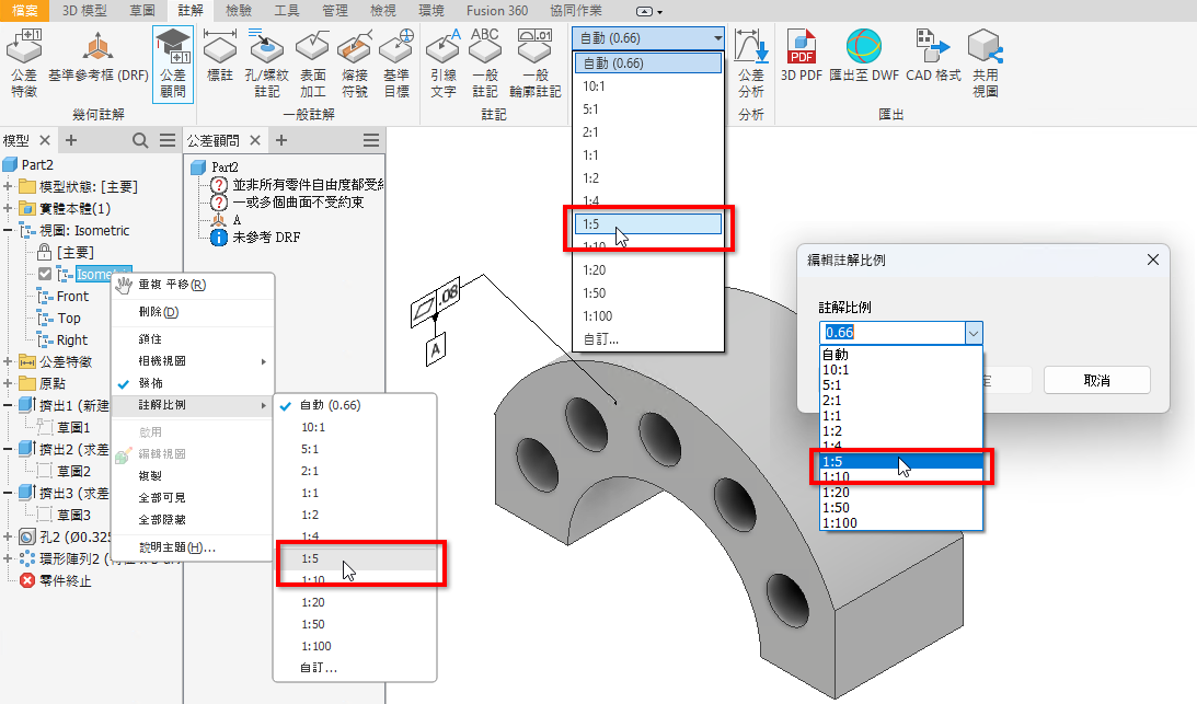 在此版本中,根據 DIN EN ISO 55455 標準,已將 1:5 縮放比例加入至註解比例下拉式清單