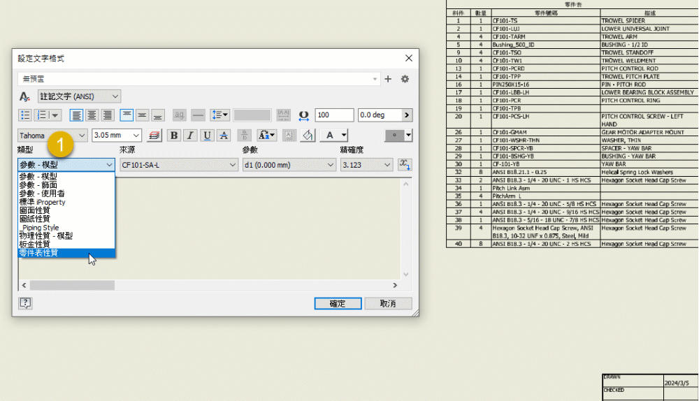 在「文字」對話方塊,已加入將零件表性質加入至任何圖面文字的功能。