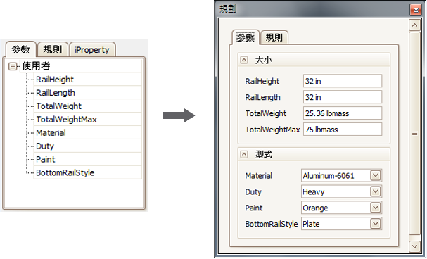 建立自訂使用者介面,並將其與 Inventor 零件、組合或圖面文件的參數、性質和規則相關聯。