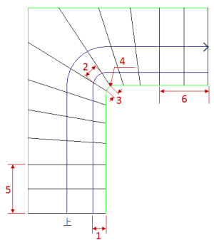 內側路線偏移 | 指定內側路線路徑與螺旋梯踏步梯段內部邊界的距離。此距離指定了測量「內側路線的最小寬度」的位置。(請參閱〈螺旋梯踏步性質〉中的第 1 項。) |