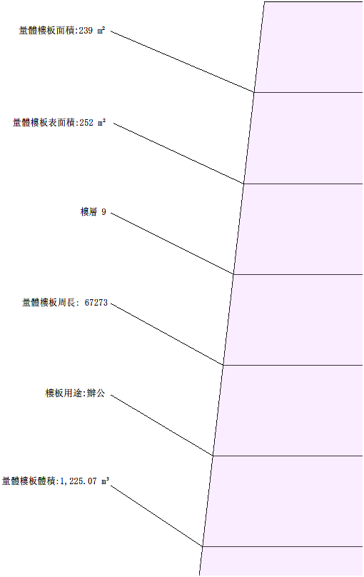 在建立量體樓板後,可在 2D 視圖中為其貼標籤。這些標籤會包括每個量體樓板之面積、外部表面積、周長、體積和用途等相關資訊。