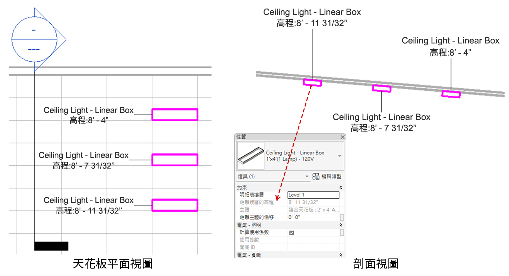 當元素放在非垂直表面上 (例如插座放在樓板上或燈具放在天花板上) 時,「距離樓層的高程」參數是不能編輯的。