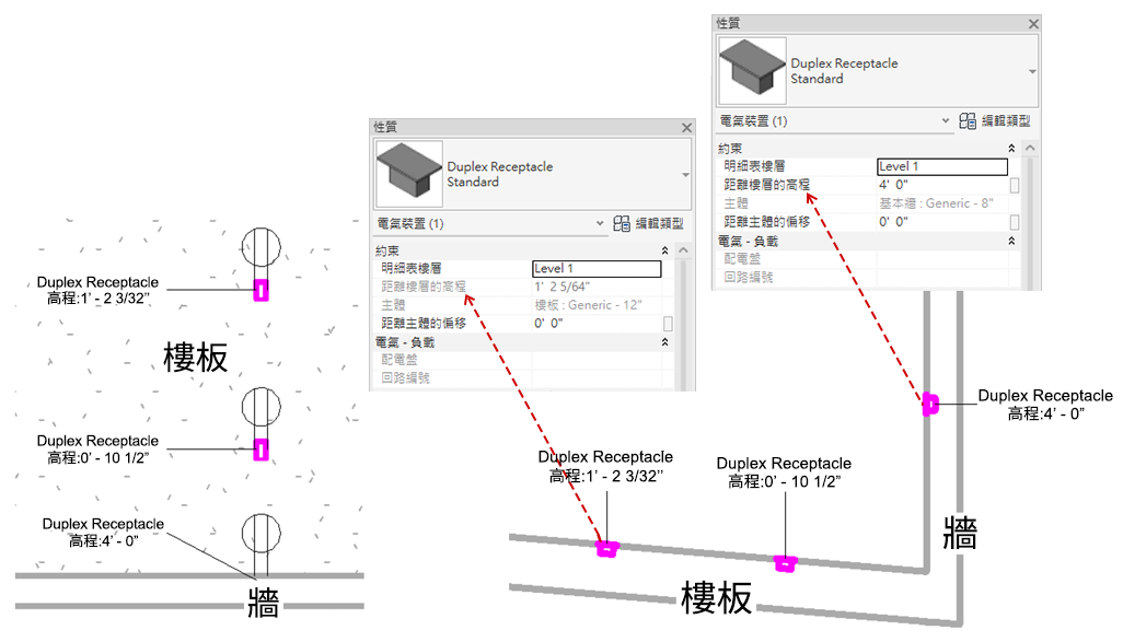 如果是以面為基礎的元素,當元素放在垂直表面上 (例如插座放在牆上) 時,「距離樓層的高程」參數是可以編輯的。