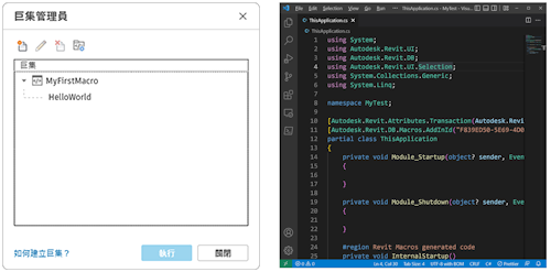 除了那些 API 延伸外,您還可以使用 API 定義在 Revit 中執行的巨集。本主題稍後將會說明 API 差異,但有經驗的開發人員則必須注意,您不需要在 Revit.ini 中登錄巨集,或加入 RevitAPI.dll 作為參考。