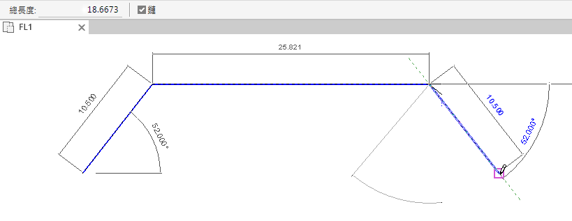 「測量」工具可讓您快速測量和暫時顯示個別牆、模型線的長度 (以及與水平方向的角度,如果適用),或在視圖中選取的兩點之間的距離。在立面視圖中,可以使用此工具僅選取與視圖方向互垂的牆的端點 (以顯示牆的高度)。您可以繪製一條暫時線或一條連接指定點的線鏈。工具產生的標註都會保留在螢幕上,直到開始下一次測量或結束此工具為止。長度標註還將顯示在選項列上的「總長度」方塊中。