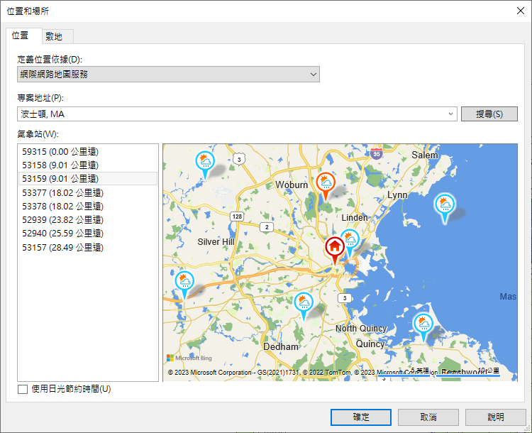 在對建築模型執行能源最佳化前,指定其地理位置並選取附近的氣象站。