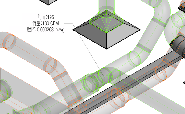 檢查並以視覺化的方式表示設計和製造網路中的壓降和流量資料。分析管段會以子元素的形式顯示在使用者介面中。這些管段可加以選取、加上標籤和加入明細表。