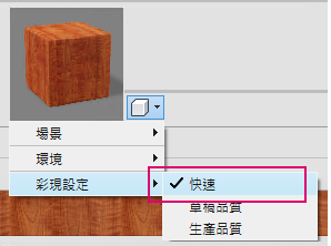 使用「材料瀏覽器」的「外觀」頁籤時,請使用材料縮圖旁邊的下拉式功能表來規劃縮圖影像的彩現設定。新加入的「快速」彩現設定可在您變更所選材料時加速產生縮圖影像。