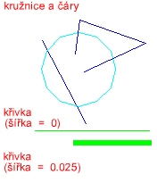 Na následujícím obrázku je vidět kružnice s překrývajícími se úsečkami a křivkami různých šířek:
