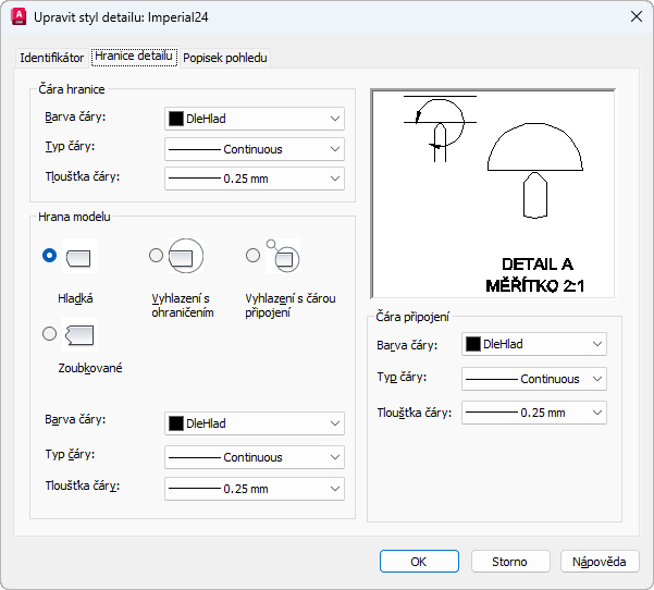 Nastavuje vlastnosti hraniční linie detailu, hrany modelu a čáry připojení v detailech.