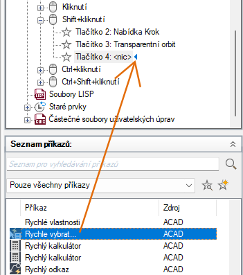 V podokně Seznam příkazů přetáhněte příkaz, který chcete přiřadit tlačítku myši, v podokně Uživatelské úpravy v