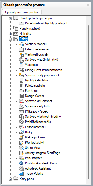- V podokně Obsah pracovního prostoru klikněte na znaménko plus (+) vedle uzlu Palety. Položka se rozbalí.