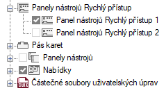 - V podokně Uživatelské úpravy: <název souboru> klikněte na znaménko plus (+) vedle uzlu Panely nástrojů Rychlý přístup. Tento uzel se rozbalí.