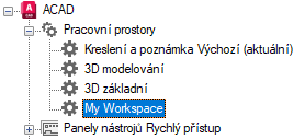 - Na kartě Vlastní v podokně Uživatelské úpravy: <název souboru> klikněte na znaménko plus (+) vedle uzlu Pracovní prostory. Tento uzel se rozbalí.