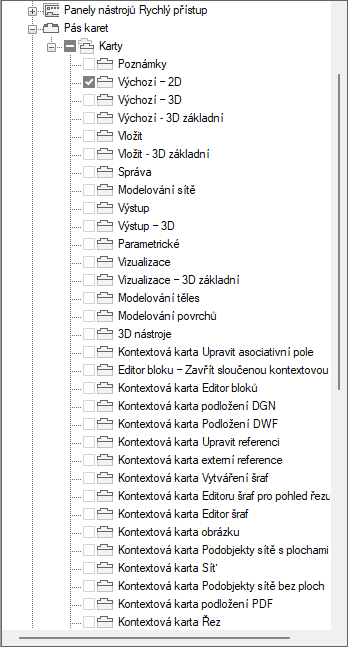 - V podokně Uživatelské úpravy: <název souboru> klikněte na znaménko plus (+) vedle uzlu Karty pásu. Tento uzel se rozbalí.