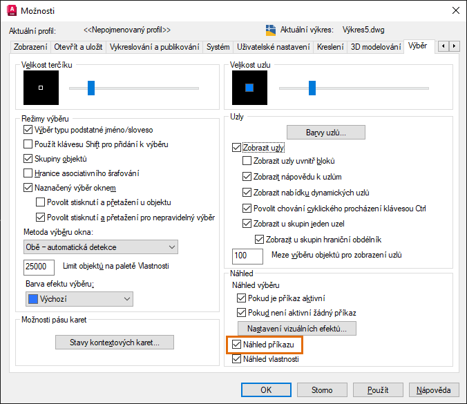 | COMMANDPREVIEW | Určuje, zda se zobrazí náhled možného výsledku příkazu. | 1 | Registr |