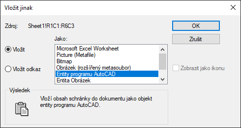 Výše uvedený příklad je pouze jedním z mnoha způsobů, jak pomocí příkazu Vložit jinak zkopírovat informace z jiných aplikací, například text ze souboru PDF, text z dokumentu aplikace Word, případně obrázky do aplikace AutoCAD. Všechny tyto položky se vkládají pomocí stejného postupu. K dosažení požadovaného výsledku možná bude potřeba experimentovat s různými možnostmi v dialogu Vložit jinak.