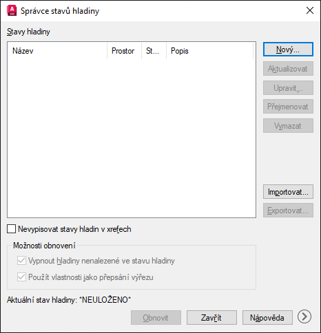 Při práci ve složitém výkresu budete možná někdy chtít nějaké hladiny vypnout, nějaké hladiny zmrazit nebo změnit vlastnosti jiných hladin. Pokud se chcete vrátit k této sadě hladin a jejich vlastnostem, použití stavů hladin vám to usnadní. Stav hladiny je jako snímek existujících hladin a nastavení hladin v okamžiku jeho vytvoření. Stav hladiny se uloží do výkresu a lze jej kdykoli obnovit. Stav hladiny lze také exportovat a importovat jej do jiného výkresu. Další možnosti, jak stavy hladin využít: